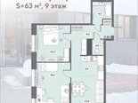 общая 63 м2, жилая 42,4 м2, кухни 18,4 м2 |