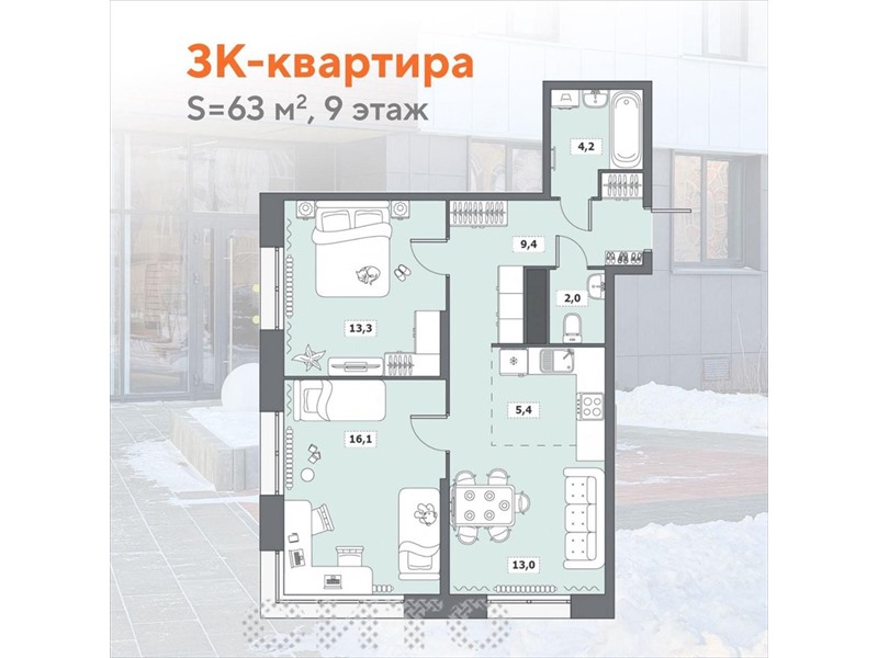 Евротрёшка 63 м² в современном доме с закрытой территорией и высоким уровнем комфорта. Редкий формат — удобная планировка, свет, приватность и сниженные коммунальные платежи. ⸻